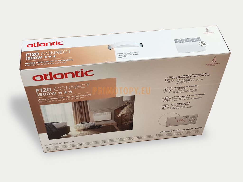 Atlantic F120-D je vybaven digitálním termostatem s Wifi připojením, individuální týdenní program se vytváří a do termostatu konvektoru ukládá přes internet prostřednictvím mobilní aplikace COZYTOUCH. Konvektor nemá záložní napájení časového čipu, dojde-li k přerušení napájení, musí se po jeho obnovení konvektor nejdříve připojit k internetu a aktualizovat si datum a čas. Pro provoz v režimu týdenního programu je tedy vyžadováno připojení k internetu. Bez tohoto připojení lze přímotop provozovat pouze v manuálním režimu.