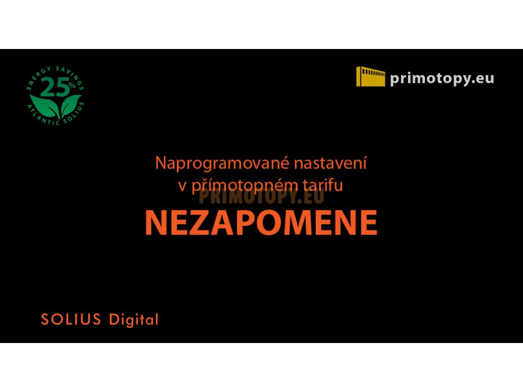 Sálavý přímotop Solius Digital 20 o výkonu 2000W, určený pro úsporné a komfortní trvalé vytápění, nárazové vytápění nebo přitápění. Bezhlučné polovodičové spínání s rychlým nástupem sálání a tepelné pohody. Solius Digital vybaven digitálním termostatem s týdenním programem. Kromě programu je možné přepnout také do jednoduchého manuálního režimu, kdy je přehledně vidět nastavená a změřená teplota. Přímotop Solius Digital kombinuje komfortní a úsporný provoz infrapanelů s dynamikou, vysokým výkonem a kompaktními rozměry přímotopů. Více než polovina tepelného výkonu je vyprodukována ve formě sálání, neboli infračerveného vlnění, což je podstatou úsporného provozu. Ve směru sálání konvektoru je vlivem emise tepelného vlnění také částečně eliminován efekt tzv. "studené podlahy" zvýšením její povrchové teploty. V porovnání s klasickými přímotopnými konvektory se jedná se o výrazně úspornější topidlo, v závislosti na provozních podmínkách a výšce stropu o 20-30%. Hybridní sálavé přímotopy jsou vhodné pro trvalé nebo přechodné vytápění prostor s důrazem na nízké provozní náklady a vysoký topný výkon. Přímotopy Solius Digital jsou určené k pevné instalaci na stěnu a připojením přívodních vodičů do instalační krabice, ale jsou vybaveny i vidlicí pro připojení do zásuvky (odstraněním vidlice nezaniká nárok na záruku). Topidla Solius Digital nejsou vybavena pádovou pojistkou a proto nejsou určena pro montáž nožiček. Provoz v jednoduchém manuálním režimu, nebo s nastaveným programem.